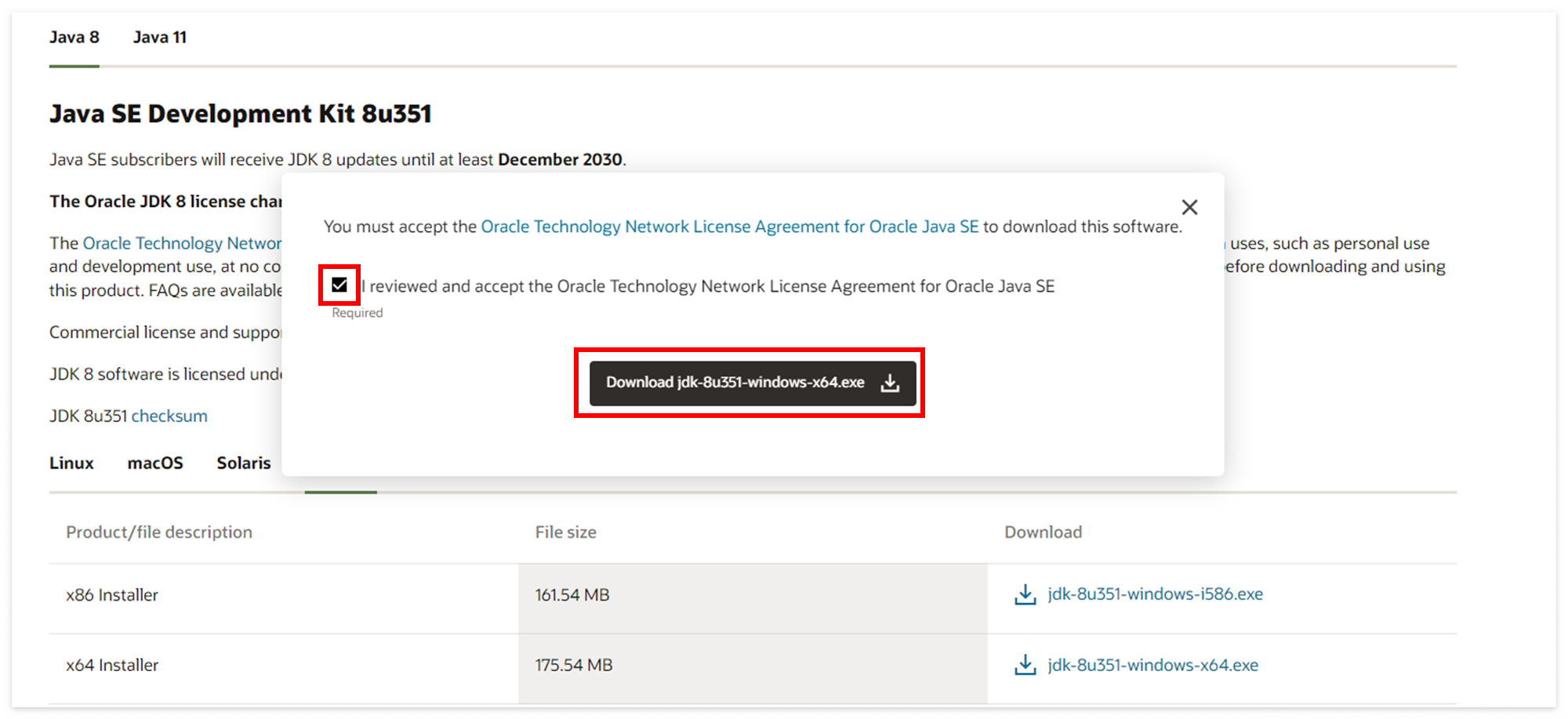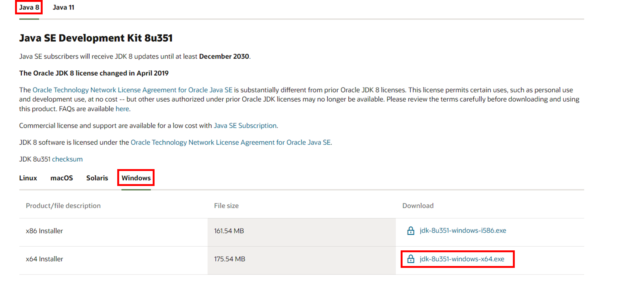 체크박스에 체크 후 Download jdk-8u351-windows-x64.exe 클릭