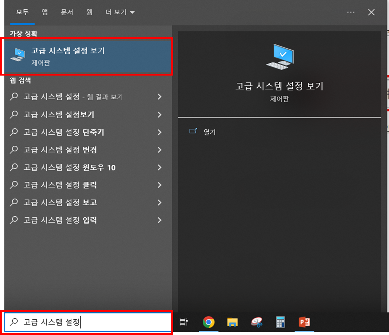 고급 시스템 설정 검색 후 고급 시스템 설정 보기 클릭