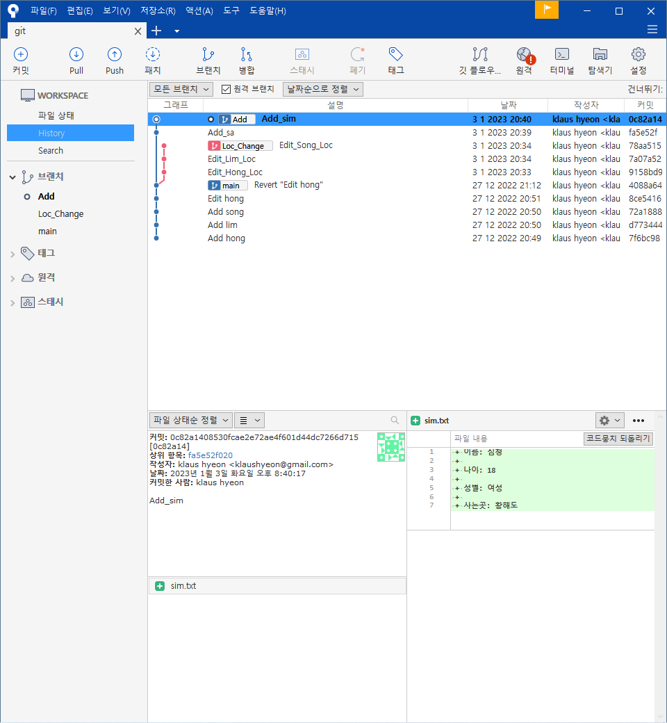 각각의 브랜치에 따라 commit 한 결과 확인 가능