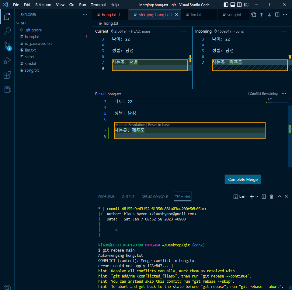 Git 독학 _ Git branch conflict [rebase] (윈도우)