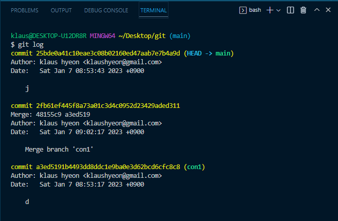 merge 완료 후 con2 branch 삭제 후 log 확인해 보세요.