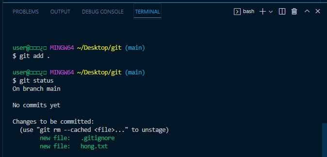 git status 확인 시 초록색 글씨와 같이 git에서 hong.txt라는 파일을 관리하기 시작함