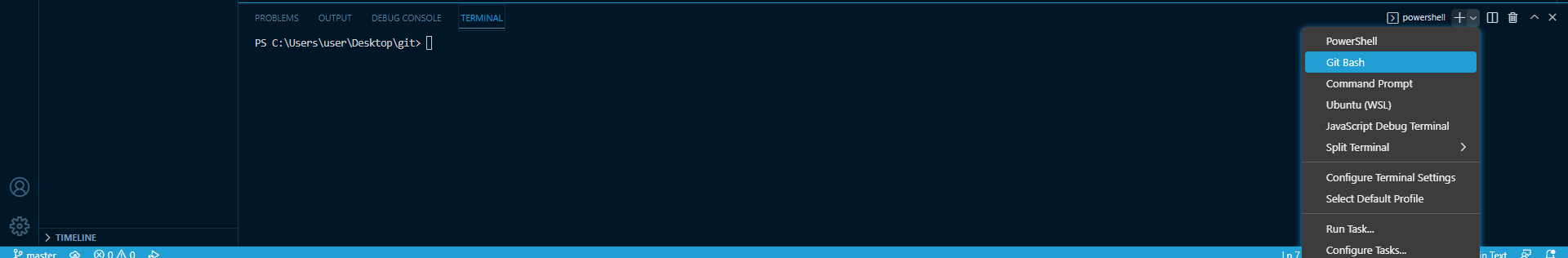 실행된 터미널 오른쪽 상단에 ∨ 누르고 Git Bash 클릭
