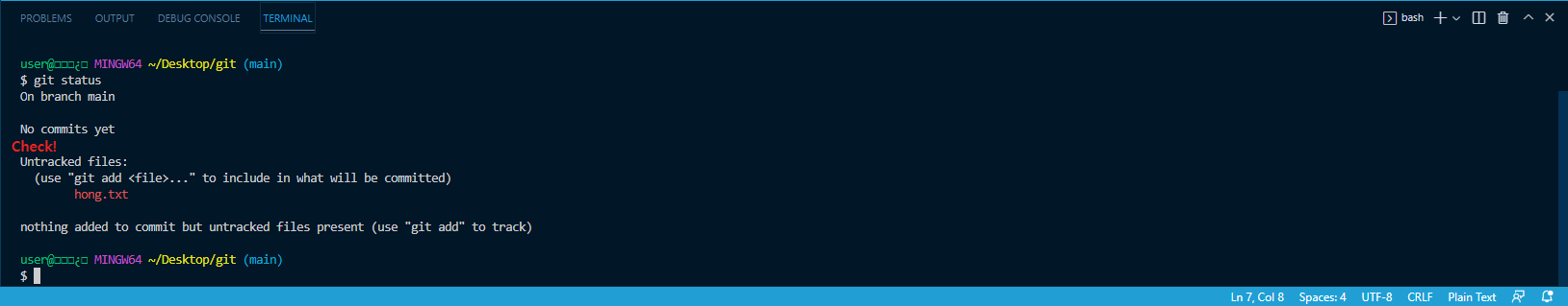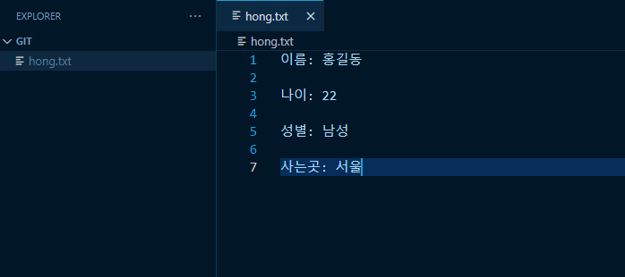 현재는 hong.txt가 아직 git이 관리하고 있지 않은 파일이라고 표시됨