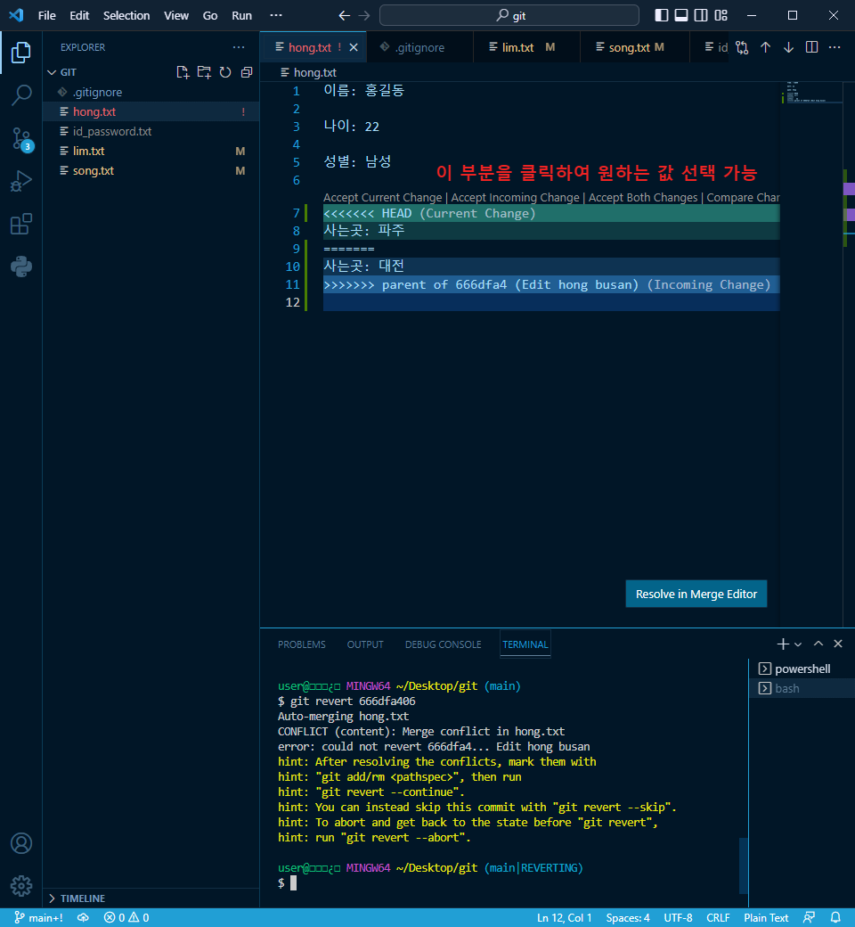 Accept Current Change, Accept Incoming Change, Accept Both Changes 중 하나를 선택하여 클릭