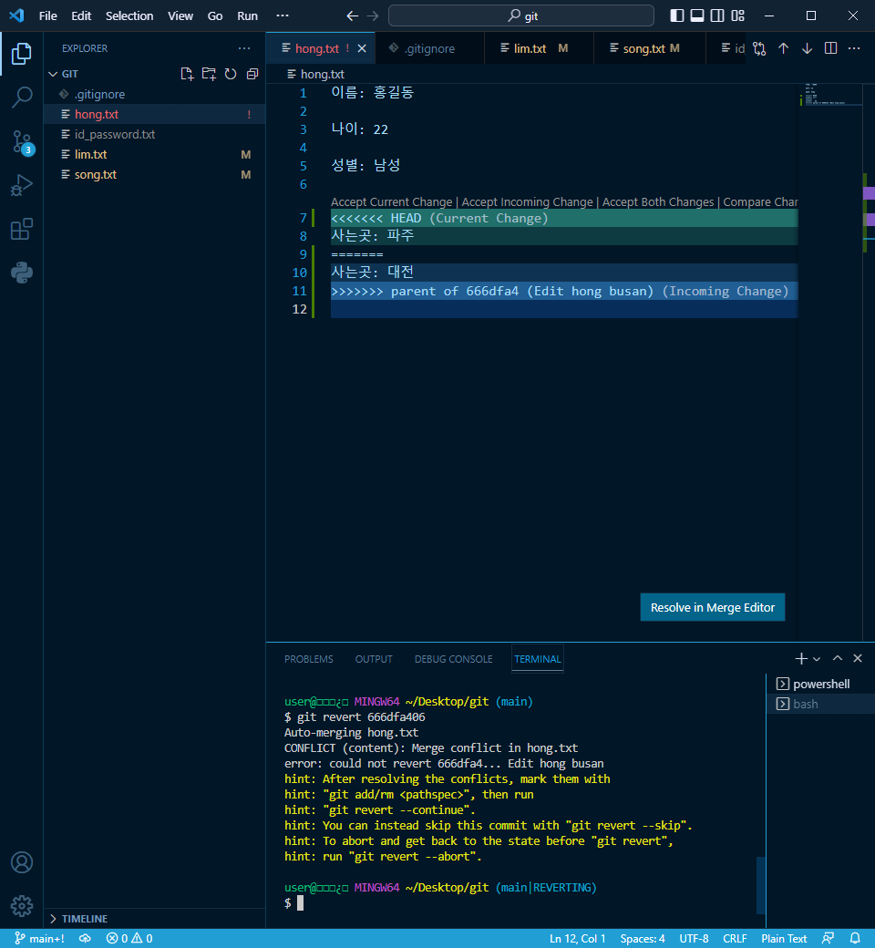 저번 글에서 Edit hong busan과 Edit hong paju 커밋 메시지 커밋 완료 된 상태에서