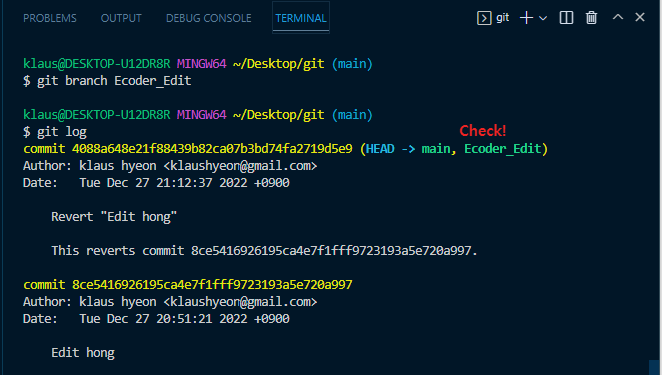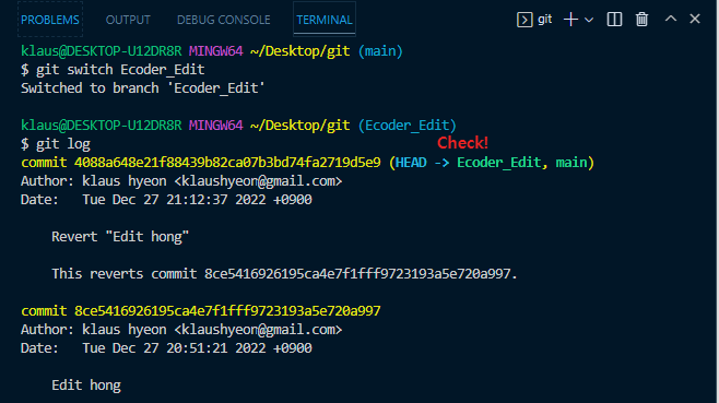 git log를 통해 Ecoder_Edit가 새로 생긴 것을 확인 가능