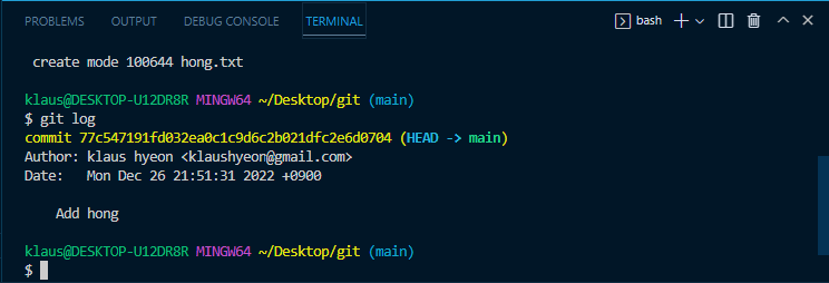 현재 Add hong이라는 커밋 메시지로 commit이 완료된 것을 확인할 수 있음.