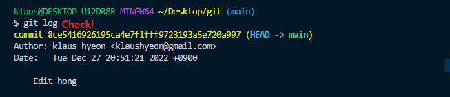 git log를 통해 Edit hong commit의 커밋 체크섬 (노란색 글씨) 확인