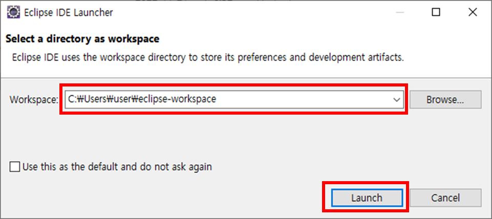 Workspace 부분에 앞으로 Java 개발 관련 파일들이 저장될 장소를 선택 후 Launch 클릭