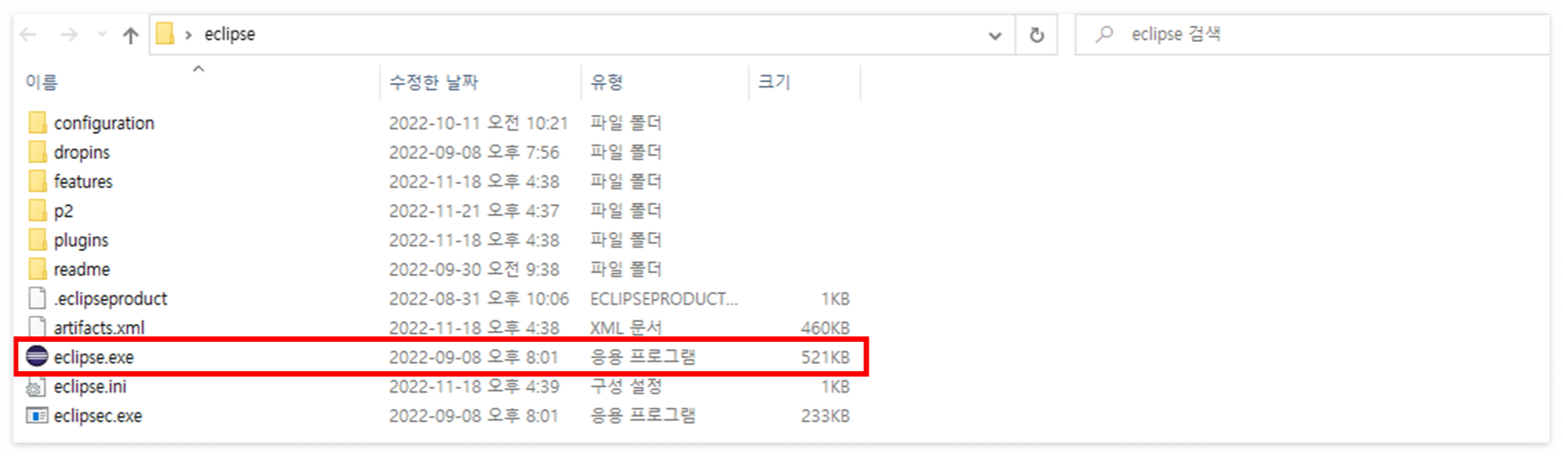 압축 해제 완료 폴더 안에 있는 eclipse.exe가 해당 프로그램 실행 파일입니다.
