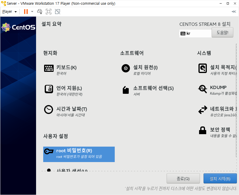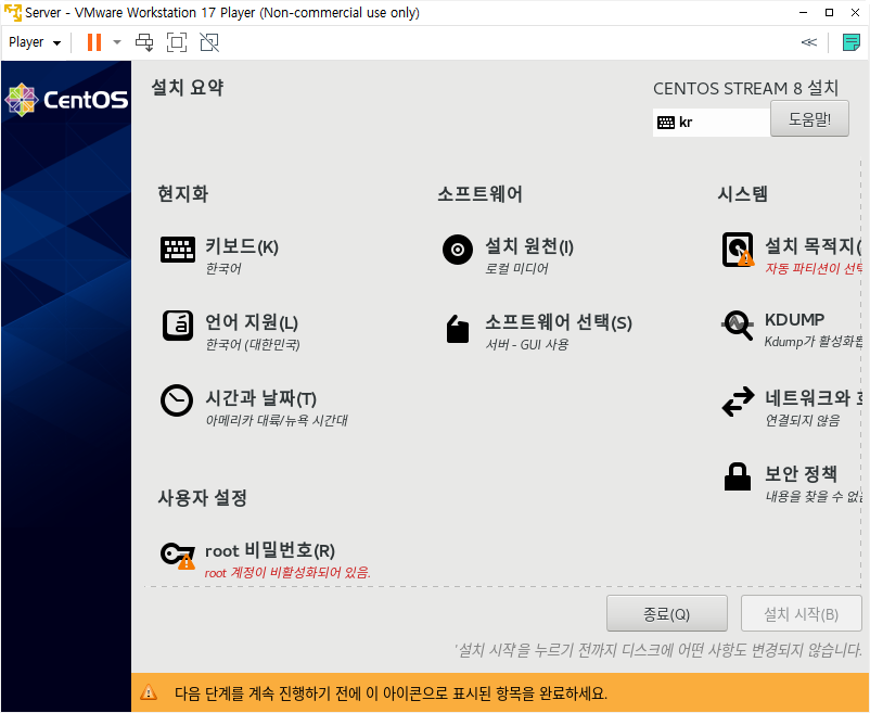 해당 창에서 "시간과 날짜", "소프트웨어 선택". "설치 목적지", "네트워크와 호스트 이름", "root 비밀번호"를 변경 할 예정입니다.