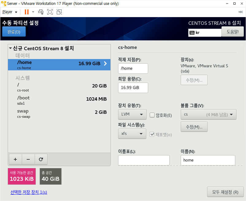 동일한 방식으로 /boot에 1G, swap에 2G, /home에 나머지 용량 부여
