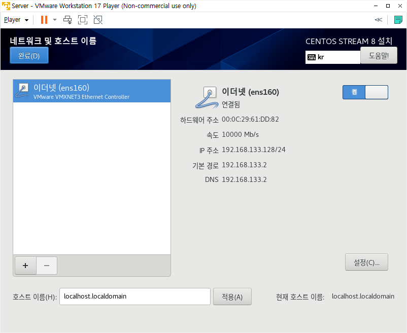 네트워크와 호스트 이름은 이더넷(ens160)을 켜놓겠습니다.