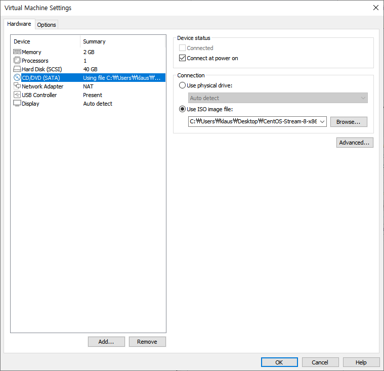 Use ISO image file 체크 후 Browse를 이용하여 전에 받은 CentOS-Stream-8-x86_64-latest-dvd1.iso 선택