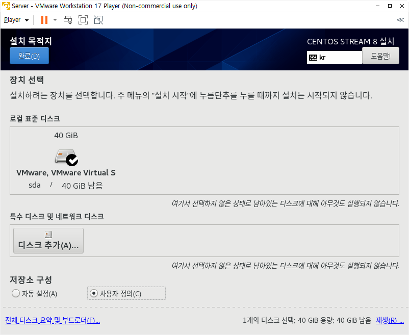 설치 목적지는 저장소 구성을 사용자 정의로 변경 후 완료