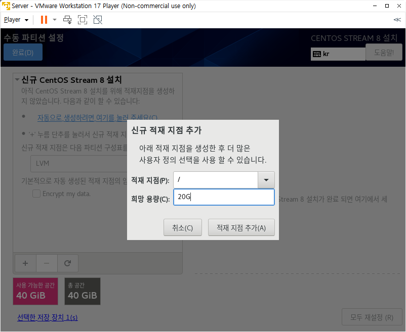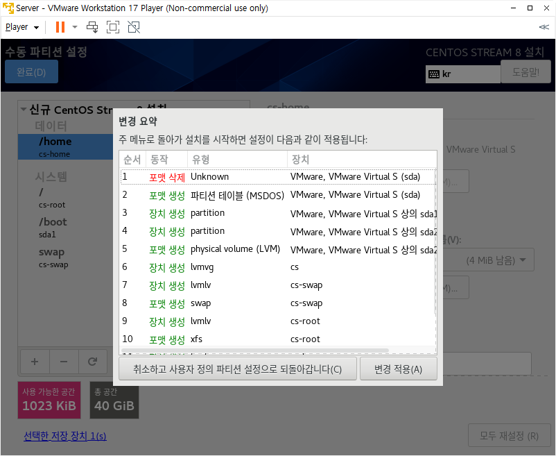 동일한 방식으로 /boot에 1G, swap에 2G, /home에 나머지 용량 부여